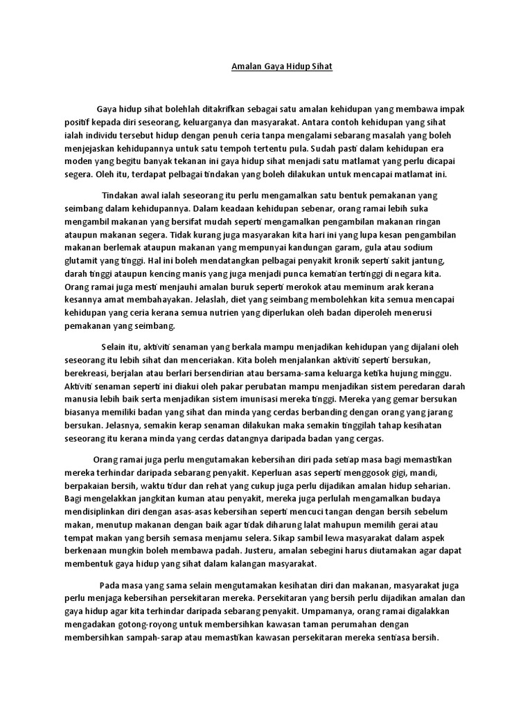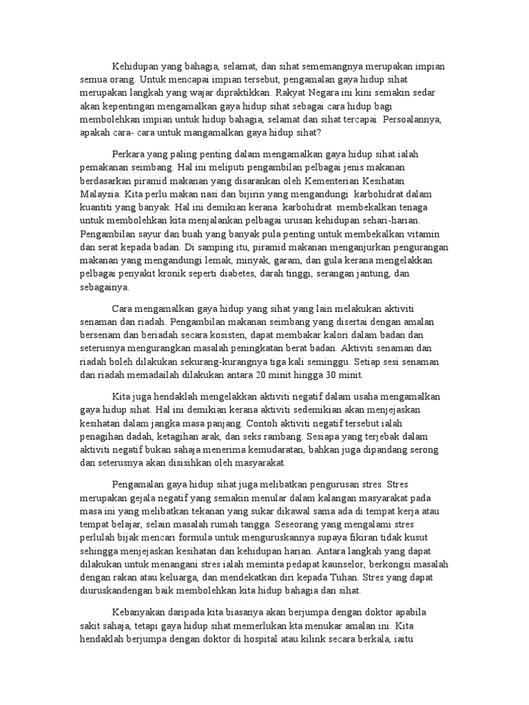 Setiap individu ingin hidup sihat dari segi fizikal dan mental. Gaya hidup sihat menjadi satu matlamat yang perlu dicapai dalam kehidupan era moden yang begitu banyak tekanan ini. Amalan gaya hidup sihat adalah cara hidup yang boleh mengurangkan risiko penyakit jantung pada masa hadapan. Insan yang sihat pastinya dapat memainkan peranan aktif terhadap pembangunan agama, bangsa dan negara. Gaya hidup sihat bolehlah ditakrifkan sebagai satu amalan kehidupan yang membawa impak positif kepada diri seseorang, keluarganya dan masyarakat. Hal ini pasti akan mewujudkan masyarakat yang hidup dalam keadaan aman dan harmoni seperti kata pepatah, bulat air kerana. Dalam meniti arus kemodenan yang berteraskan sains dan teknologi maklumat. A collection of gaya hidup sihat essay. Prakarsa pertama untuk menjadikan membaca sebagai amalan hidup ialah, saya perlulah rajin pergi ke perpustakaan. Hal ini pernah saya alami sendiri, ketika saya. Namun, banyak yang gagal atau malas menjalani pola hidup tersebut karena dianggap sulit dan menyusahkan. Kehidupan yang bahagia,selamat dan sihat merupakan kehidupan impian semua orang. Abdullah ( tingkatan 5 ibnu haitham) pelajar tingkatan 5 wajib menyalin karangan di bawah.
