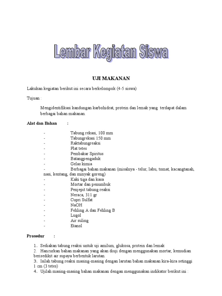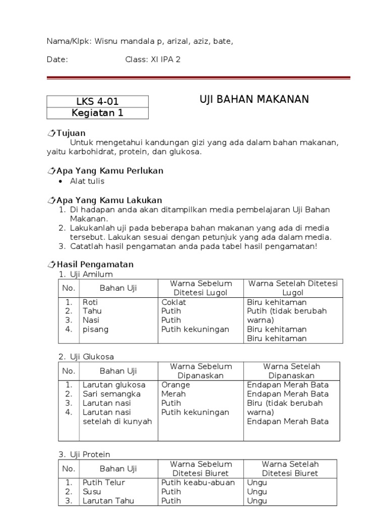 Dan menegetaui apa saja makanan yg mengandung lemak , glukosa , protein dan amilum. Mengisi tabung reaksi dengan bahan makanan yang sama seperti pada percobaan uji protein. · teteskan ektraks bahan makanan pada pelat tetes.tempelkan label kecil. Ø uji protein, tempe mengandung protein karena setelah ditetesi reagen biuret warna menjadi ungu. Guru model menyapa siswa kemudian menginformasikan aktivitas siswa selama 2×40 menit.